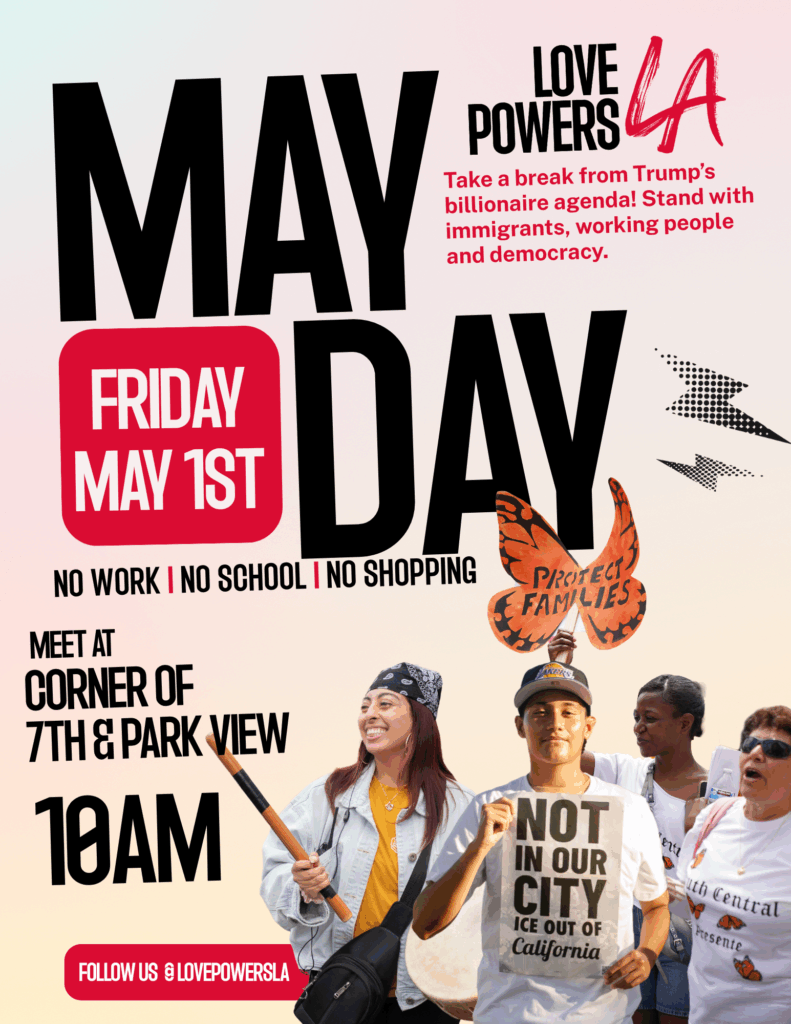 Join LOVE POWERS LA at the May Day rally. Bring your signs, noise makers, and good vibes! This event is for anyone and everyone who wants to show their love for the people who make our communities and city run.
